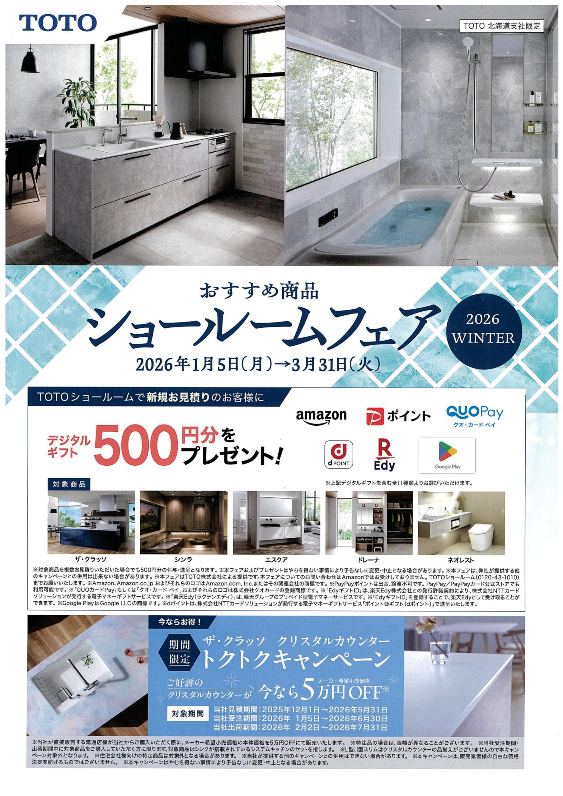 TOTOさんのショールームにて、2026年1月5日(月)~ 2026年3月31日(火)の期間、おすすめ商品ショールームフェアが開催されています。